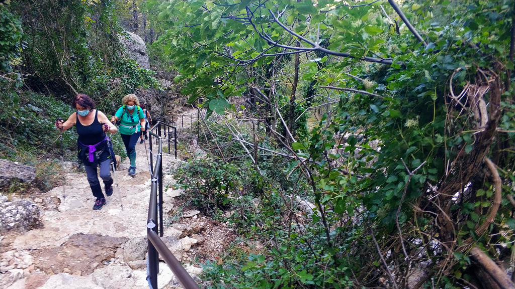 en la singular Cueva de los Chorros, de origen kárstico, se produce el insólito fenómeno del “reventón”; expulsando caudal desde 50 l/s normales hasta un máximo de 100.000 l/s, sólo un día a máxima fuerza y en invierno a más de 80 m de altura. Nos hacemos las fotos típicas en el primer mirador (el segundo está cerrado)