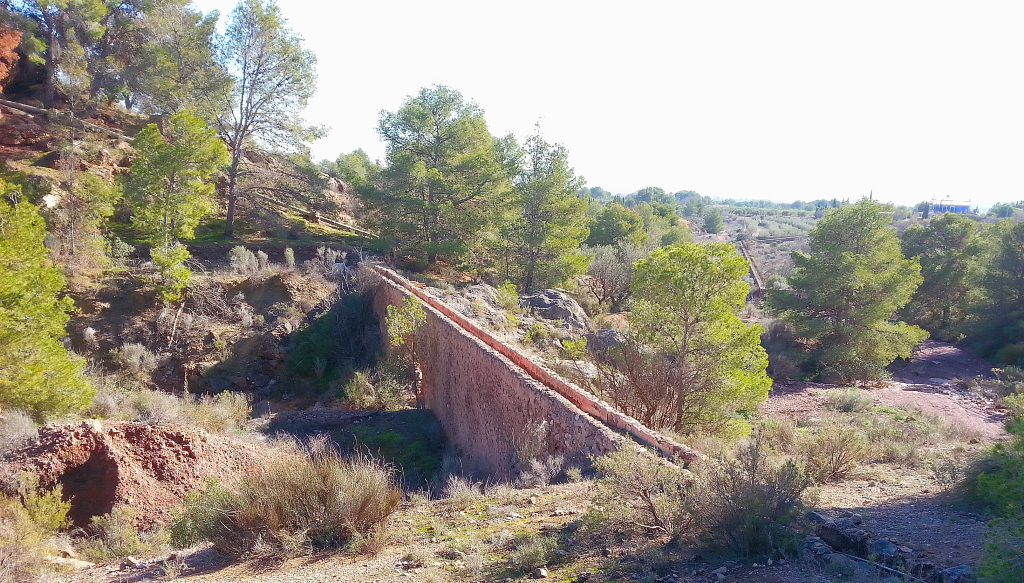 Salgo carretera arriba un 200 m, la cruzo y desciendo a la Rambla de La Santa; tras su repecho correspondiente, llaneo por la antigua Acequia de la Carrasquilla, un canal en desuso con tubería;