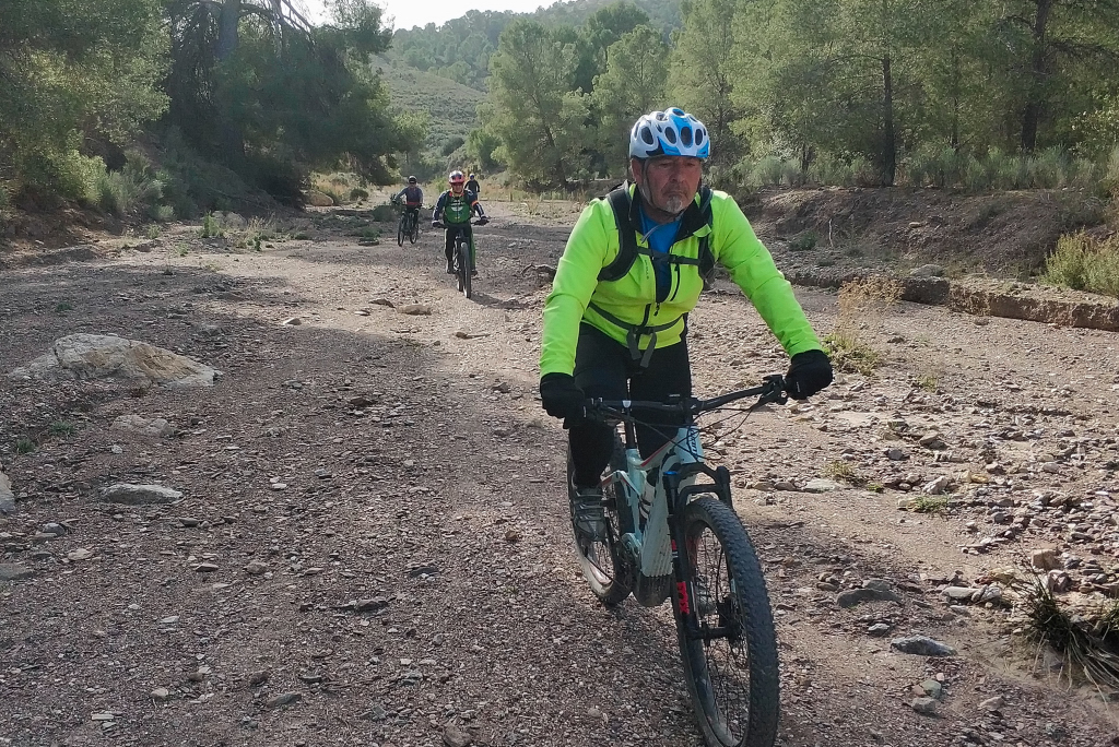 se recrudece el ascenso con tramos pedregosos de empujar bicis, vamos paralelos a la Rambla de la Quinquilla, hasta alcanzar la Fuente del Cejo de los Enamorados.