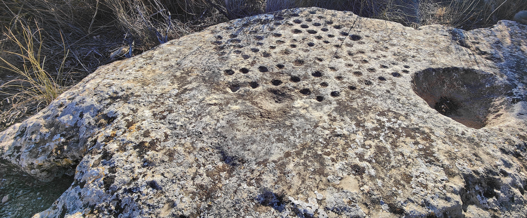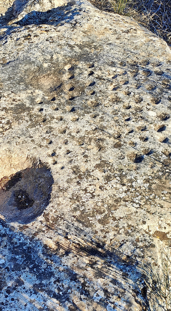 Vemos la cazoleta sin canalillo, los geométricos hoyuelos/alveolos esculpidos en la roca