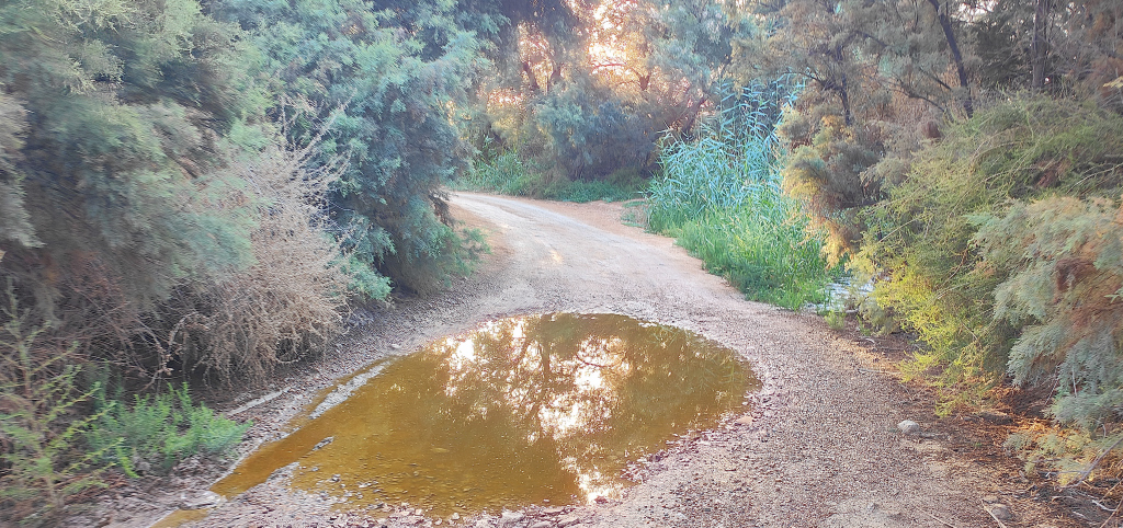 Accedo desde la Autovía Totana-Mazarrón (RM-3), a su final en la rotonda, continuo por la RM-332 y en la siguiente rotonda hacia Mazarrón, aparco en el Mercadona. Cruzo la carretera pedaleando al Alba por pista paralelo a la Rambla de las Morenas;