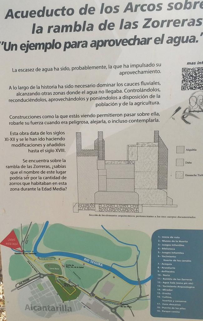 formado por tres acueductos adosados entre sí para albergar los canales de las acequias Alquibla, Turbedal y Dava, con el fin de salvar el desagüe de la rambla de las Zorreras en el río Segura,